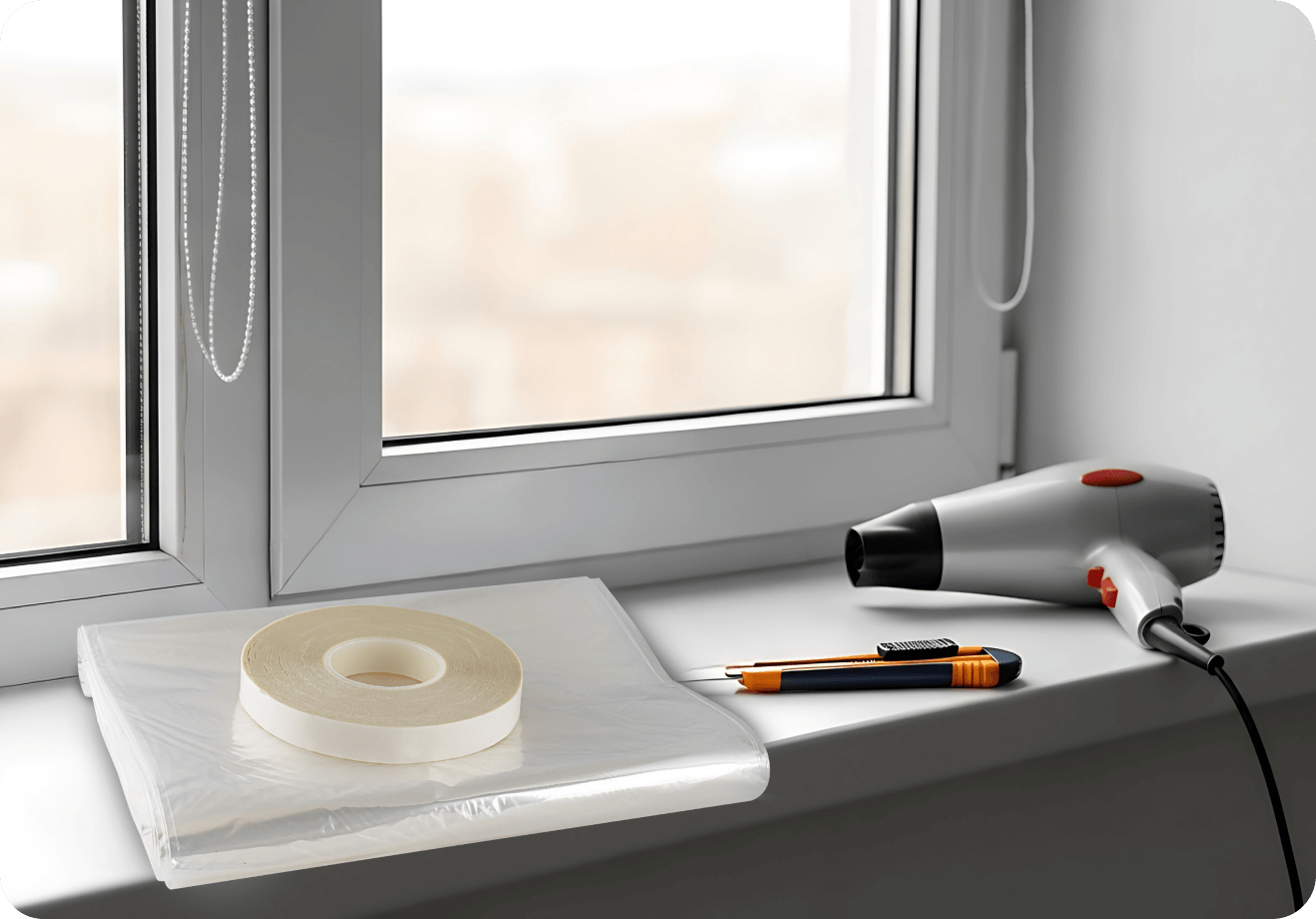 Simply cut film to size, apply it to window with double sided tape (included), and shrink-to-fit with a hair dryer.
